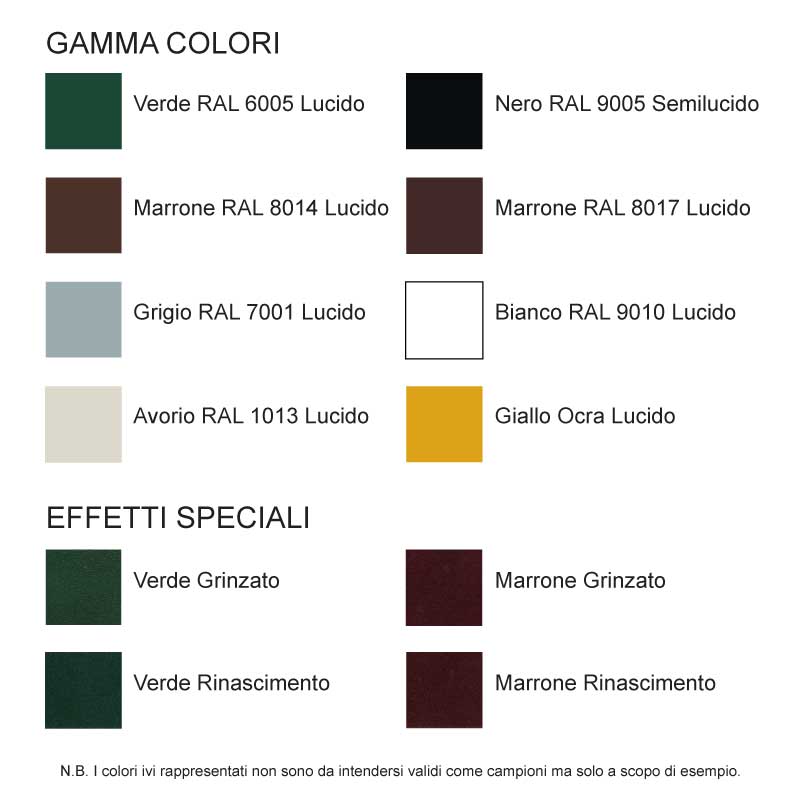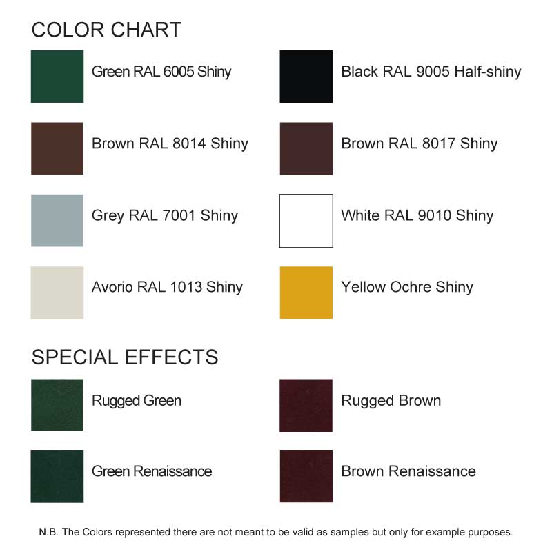 Окраска производится с собственной окраски завода, с порошковым покрытием в широком диапазоне цветов. Этот процесс, в отличие от жидкой краски, обеспечивает высокую прочность материала и требует минимального технического обслуживания.