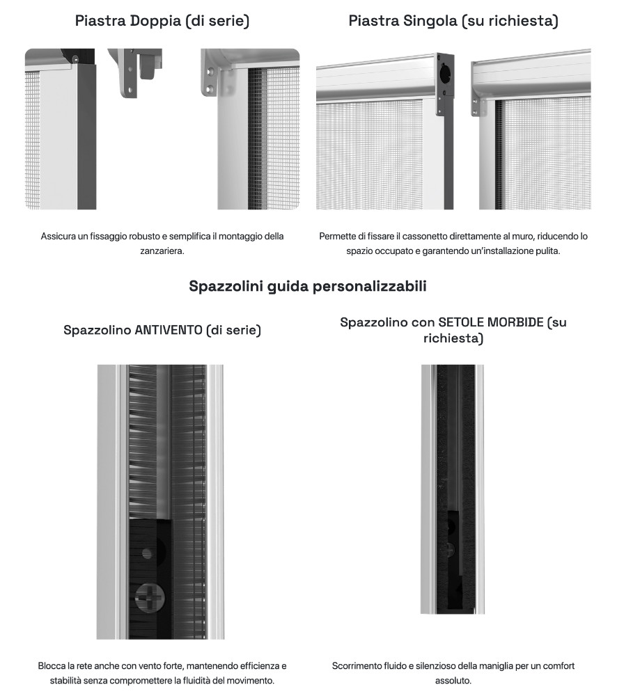 Устойчивость даже при сильном ветре Боковые направляющие с ветрозащитными щётками (стандартная комплектация) надёжно фиксируют сетку даже в ветреную погоду, не снижая её плавности. Для ещё более тихого и плавного скольжения можно выбрать щётку с мягкой щетиной (опция по запросу).