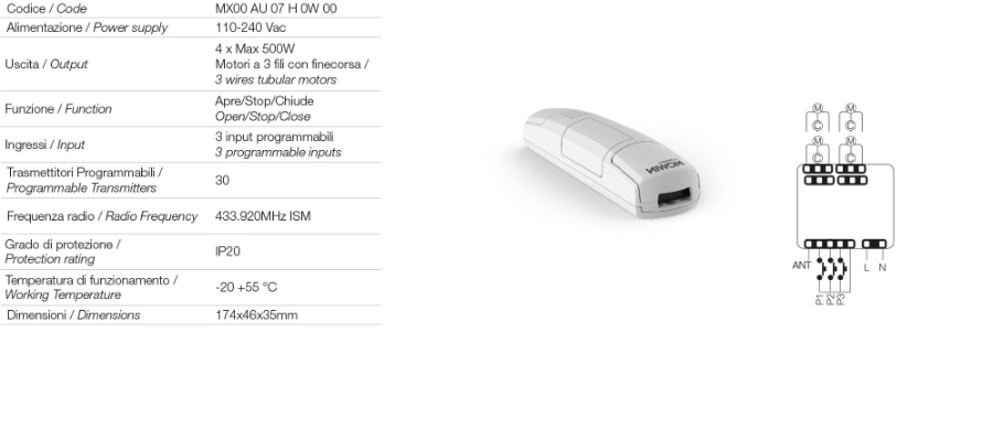 может управлять до 4 приводами на 230 В переменного тока, каждый с максимальной мощностью 500 Вт, и совместим с 3-проводными двигателями с концевыми выключателями. 3 программируемых проводных входа могут быть настроены для пошагового управления, управления с помощью аварийного отключения или для управления датчиками погоды. Функции открытия, остановки и закрытия полностью настраиваемы, что делает систему подходящей как для жилых, так и для профессиональных помещений.