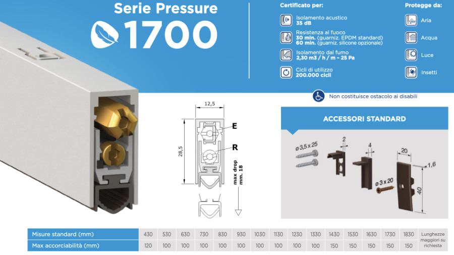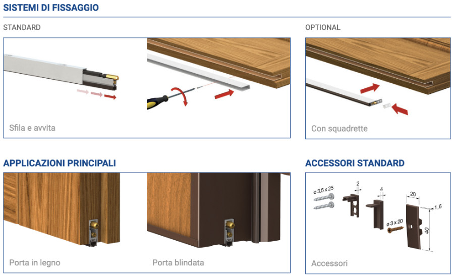 Устройство предотвращения сквозняков Comaglio 1700 представляет собой запатентованную автоматическую систему, которая при закрытии двери автоматически блокирует возможность проникновения холода, пыли и шума в окружающую среду.