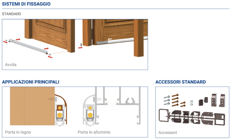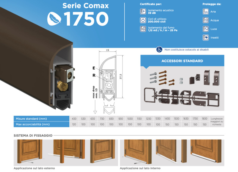 Устройство исключения сквозняков Comaglio 1750 Comax представляет собой запатентованную автоматическую систему, которая при закрытии двери автоматически блокирует возможность проникновения холода, пыли и шума в окружающую среду.