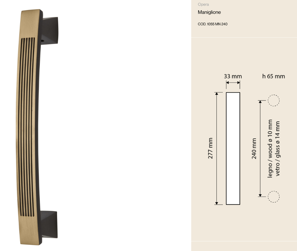 Изготовленная полностью из латуни в ремесленном районе Брешии, ручка-скоба Opera демонстрирует внимание к деталям и качество изготовления, которые всегда отличали продукцию, произведенную в Италии. Точная, чётко выраженная рифлёная поверхность подчёркивает прочность металла и создаёт игру света и тени, подчёркивающую его глубину и элегантность.
