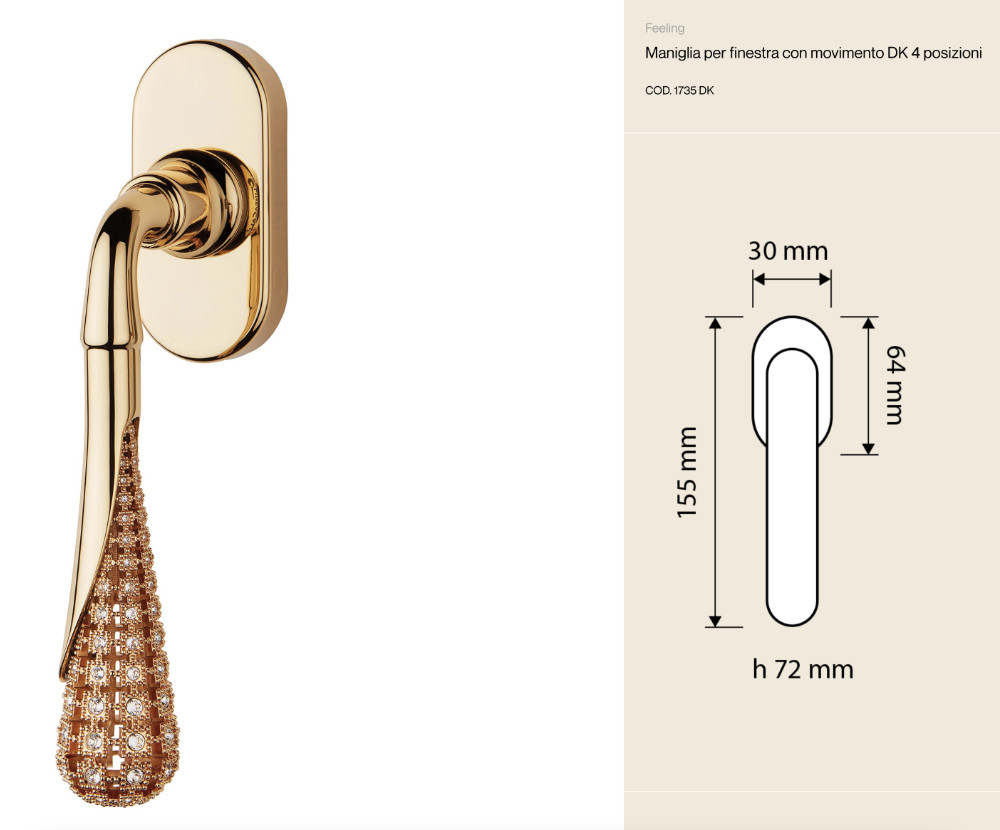 Каждая ручка Feeling Linea Calì полностью производится в Италии с особым вниманием к деталям и использованием качественных материалов. Это идеальный выбор для тех, кто хочет добавить нотку роскоши и индивидуальности окнам своих домов или эксклюзивных помещений, таких как отели и бутики.