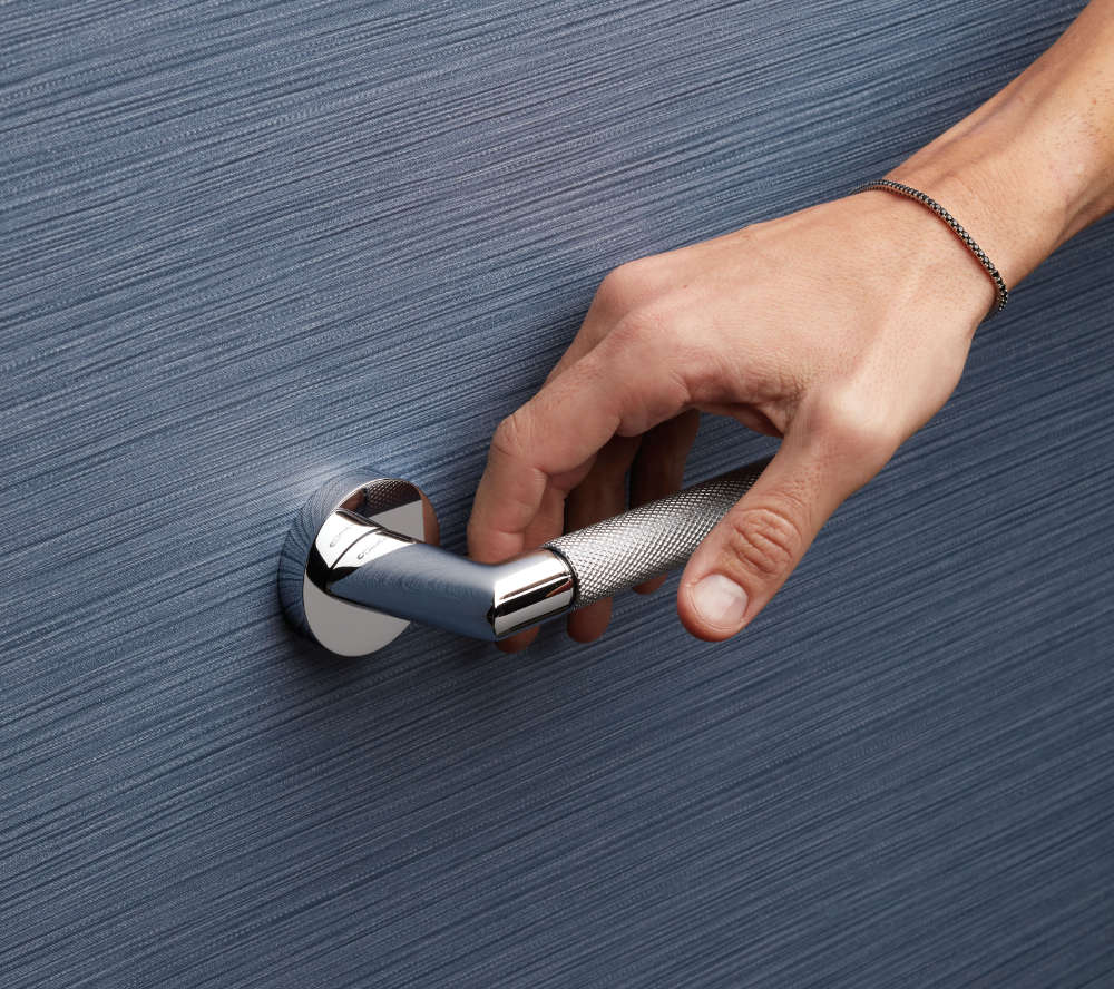 Доступный в различных вариантах отделки — от изысканного чистого золота до технического матового черного и современного полированного хрома — Grip адаптируется к любой обстановке, сочетая как классические пантографические двери, так и более минималистичные и современные решения.