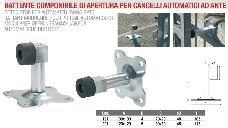 Автоматические распашные ворота BREVETTI ADEM 2 BLOCK : модульный стопор для автоматических ворот, используемый для остановки хода распашных ворот. Этот предмет можно разместить как на полу, так и на стене.