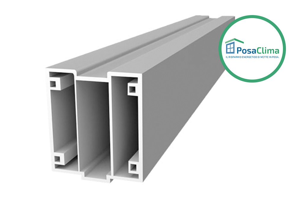 Нижняя поперечина Klima изготовлена из экструдированного коробчатого профиля из ПВХ, что обеспечивает одновременно большую жесткость и ударопрочность. Он спроектирован с внутренними ребрами профиля для крепления крепежных винтов. Секция разделена на 3 камеры, чтобы иметь более эффективный термический разрыв и большую устойчивость к пешеходному движению: фактически, она «проходимая».