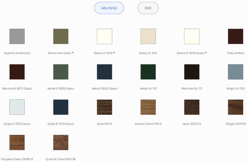 Цветовая гамма : линия противомоскитных сеток Officine Rami доступна в широком выборе цветов. Выберите оттенок, который вы предпочитаете, чтобы персонализировать свою покупку. Важно отметить, что представленные цвета являются лишь ориентировочными. Это общий визуальный ориентир, который не следует использовать в качестве точных стандартов для сравнения цветовых вариаций с реальными продуктами.