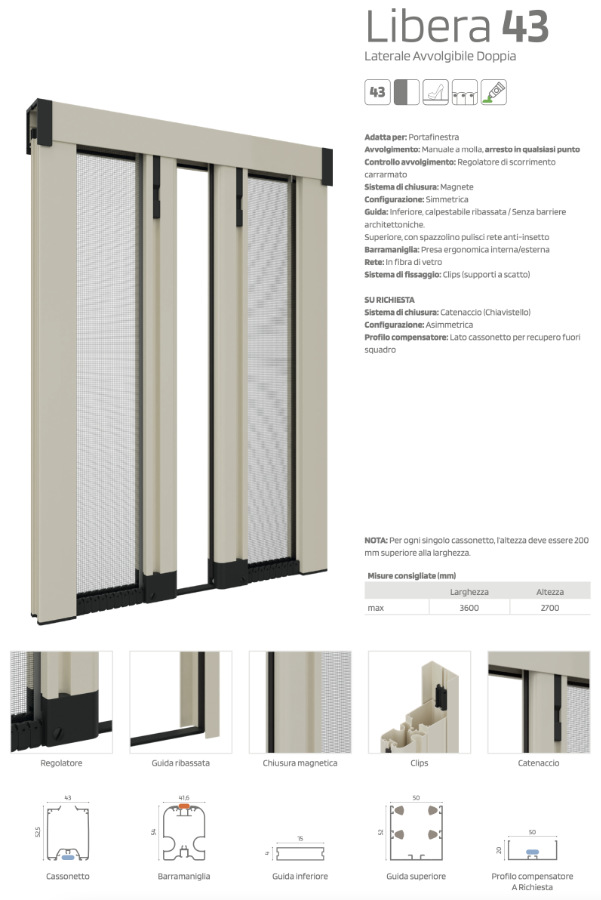 - Направляющие для пешеходного пола: революционный дизайн с направляющими для пешеходного пола является важным преимуществом. Эти направляющие, встроенные в пол, обеспечивают легкий и безопасный проход, устраняя любые потенциальные препятствия. Это делает москитную сетку «Libera 43 Laterale» подходящей для любых помещений, включая те, где требуется доступ для детских колясок.
