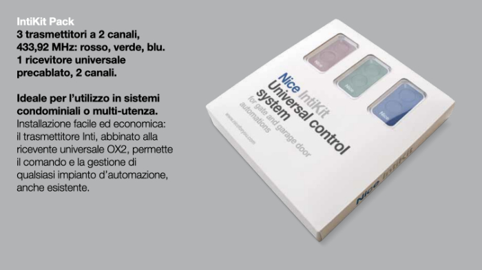 Простая и экономичная установка : передатчик Inti в сочетании с универсальным приемником OX2 позволяет контролировать и управлять любой системой автоматизации, даже существующей.