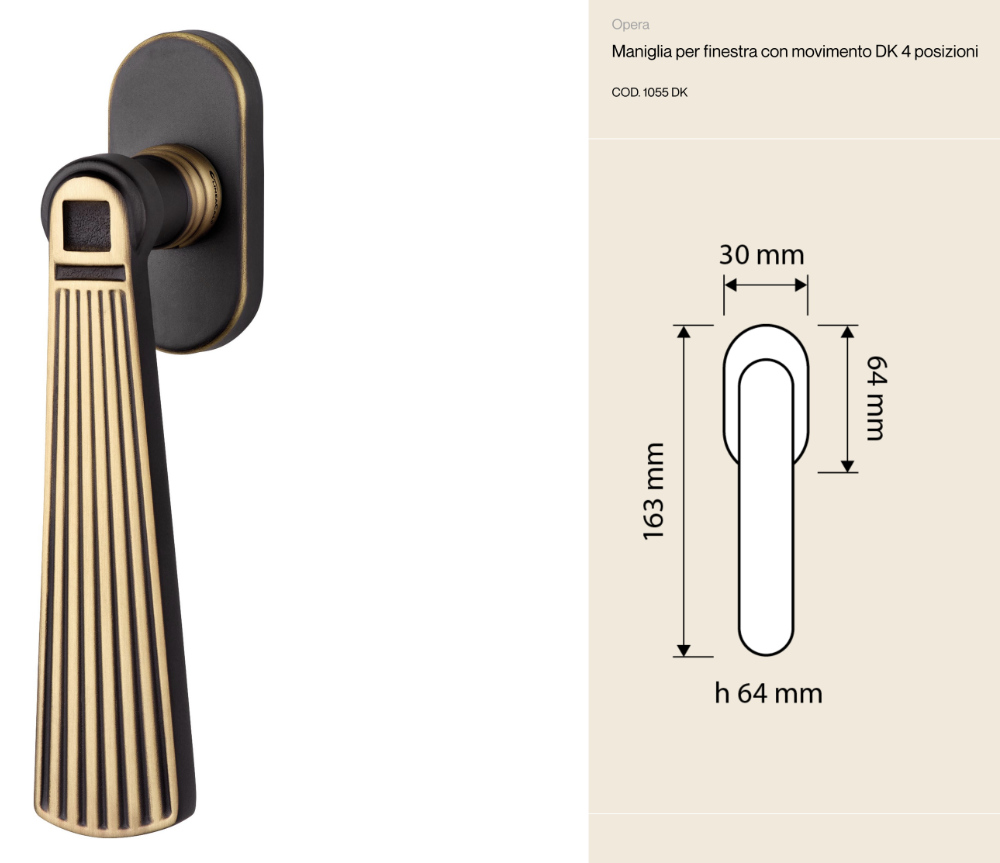 поворотно-откидная оконная ручка Opera Linea Calì переосмысливает каноны неоклассицизма, придавая им современный и изысканный вид. Её чистые, гармоничные вертикальные линии напоминают торжественные формы классической архитектуры, придавая окну сбалансированность, утончённость и вневременную элегантность.