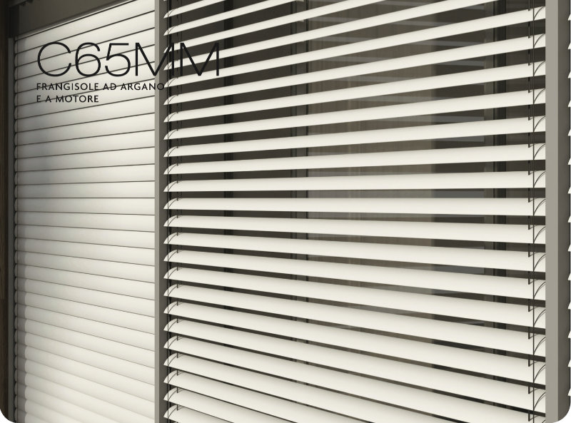 Солнцезащитный экран C65 Centanni — это модель, подходящая для наружной установки в небольших помещениях, с изогнутой планкой шириной 65 мм, окантованной шумопоглощающей прокладкой, и жесткими боковыми скользящими направляющими.
