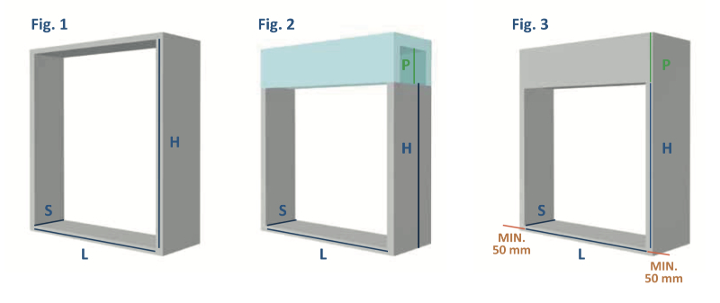 - Консольный монтаж L + (50 мм + 50 мм минимум) x H + уплотнение (P) (см. РИС. 3)