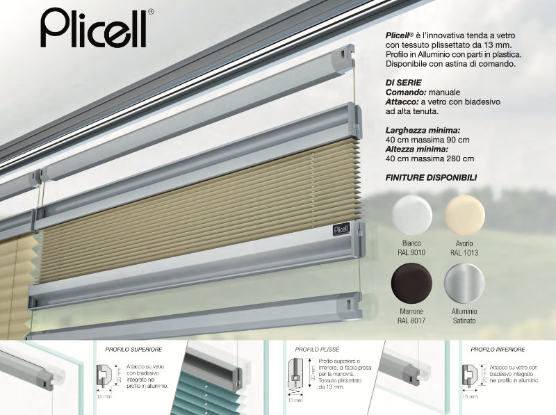 тонкий и элегантный . Эта плиссированная штора для стекла подходит для любого типа помещения и доступна в четырех вариантах: три глянцевых покрытия и один сатинированный алюминий.