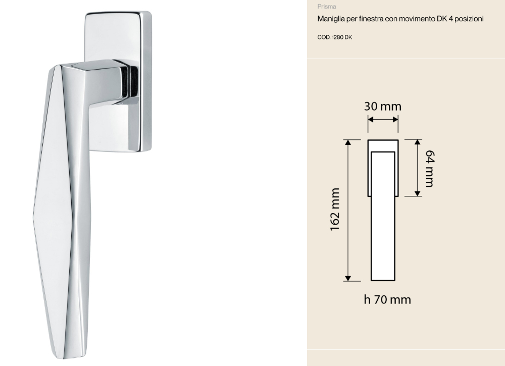 Существуют оконные ручки, которые выполняют не только функцию открывания и закрывания: ручка DK Prisma Linea Calì — настоящее произведение искусства. Благодаря ромбовидной форме ручки и гранёным поверхностям она улавливает и отражает свет, меняя его форму, превращая каждое окно в эффектный элемент интерьера.
