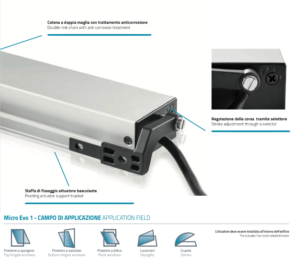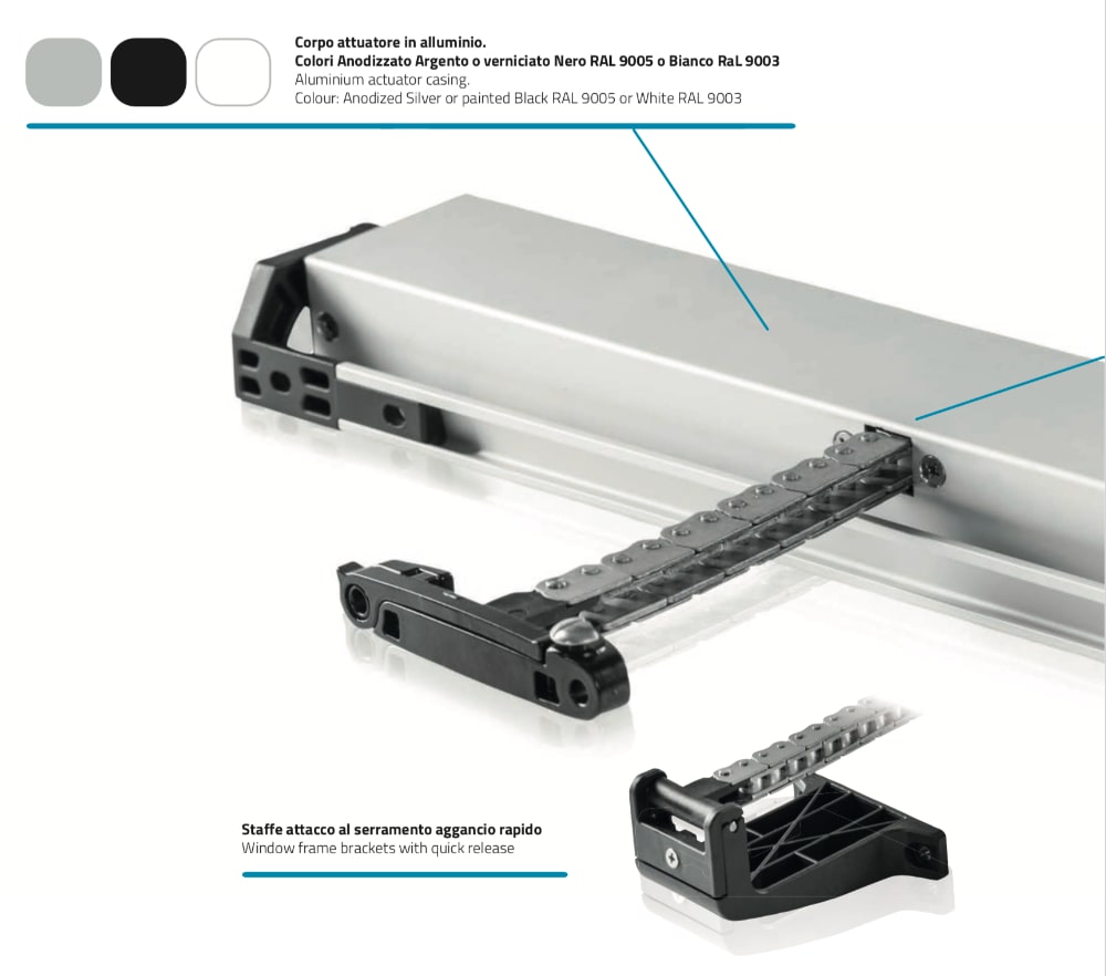 Micro Evo 1 Mingardi: линейный электрический привод с двухзвенной шарнирно-сочлененной цепью, заключенный в металлический корпус.