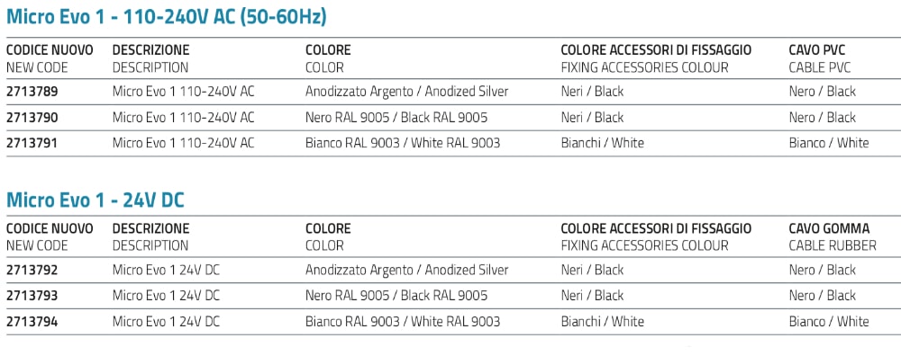 Кабель: 110-240 В переменного тока: черный или белый ПВХ / 24 В постоянного тока: черный или белый РЕЗИНОВЫЙ - L.1500;