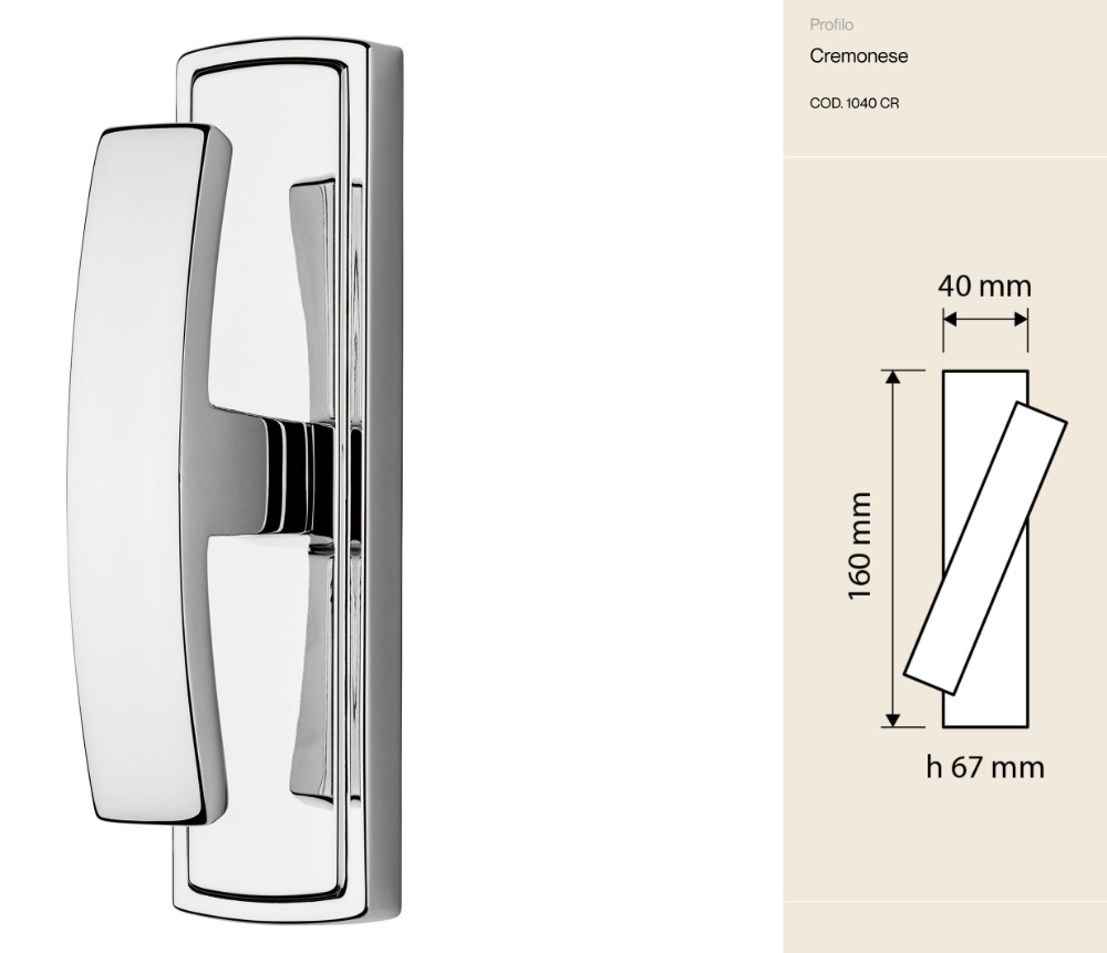 С 1986 года компания Linea Calì создаёт ручки Cremonese, которые сочетают в себе дизайн и функциональность , превращая простой жест в повседневную элегантность. Ручки Cremonese — это оконные ручки с вертикальным рычагом , используемые для запирания и отпирания створки с помощью практичной и надёжной системы.