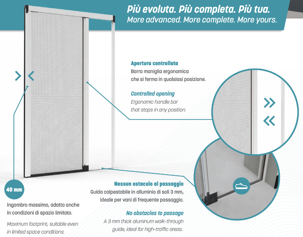 Proxima — это москитная сетка, произведенная в Италии, которая сочетает в себе передовую защиту, инновационные технические решения и продуманную до мельчайших деталей конструкцию. Каждый элемент разработан для обеспечения высокой эффективности: от контролируемого бокового сворачивания до системы выдвижных направляющих и эффективной ветрозащитной системы, обеспечивающей надежность и комфорт в течение длительного времени.