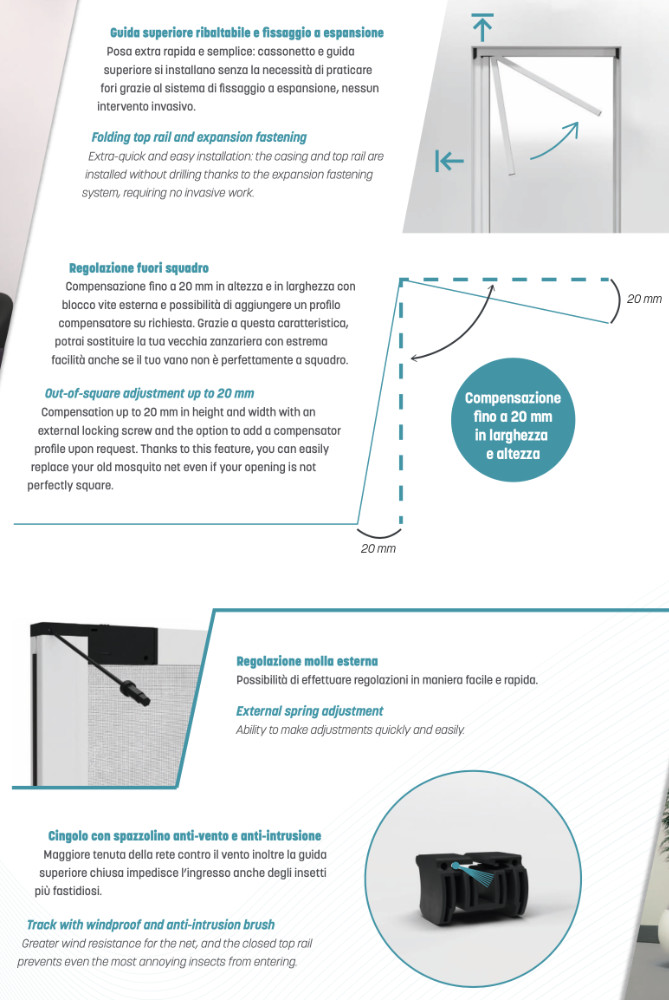 Регулировка неквадратности Система компенсации до 20 мм по высоте и ширине, с внешним винтовым креплением и возможностью установки компенсирующего профиля по запросу. Это решение позволяет быстро и легко заменить существующие москитные сетки даже в неровных пространствах.