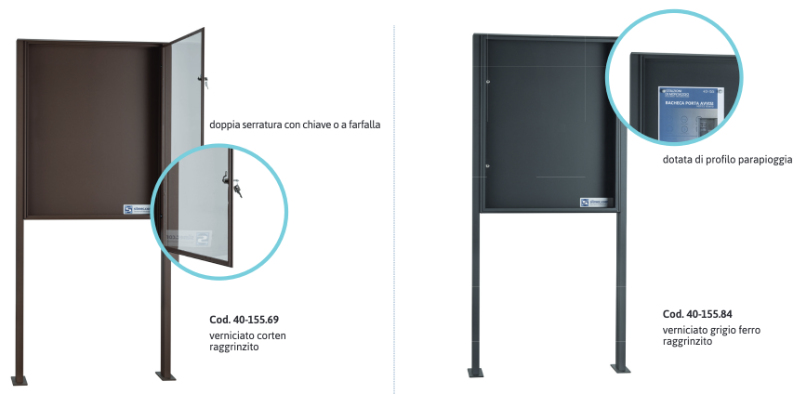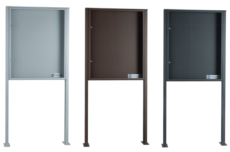 Самонесущая доска для объявлений доступна в трех различных версиях , как для внутренней, так и для внешней установки, и поставляется с четырьмя комплектами серебряных магнитов, всего шестнадцать магнитов. Открывание двойным замком с ключом (для предотвращения открытия без ключа) или двойным замком-бабочкой (может открыть любой).