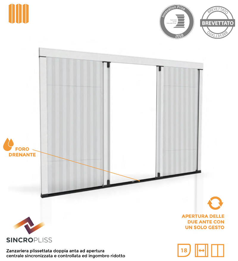 Sincropliss Effezeta System представляет собой двустворчатую гофрированную москитную сетку с синхронизированным центральным открытием . Главное преимущество этой модели в том, что двери открываются одним движением.