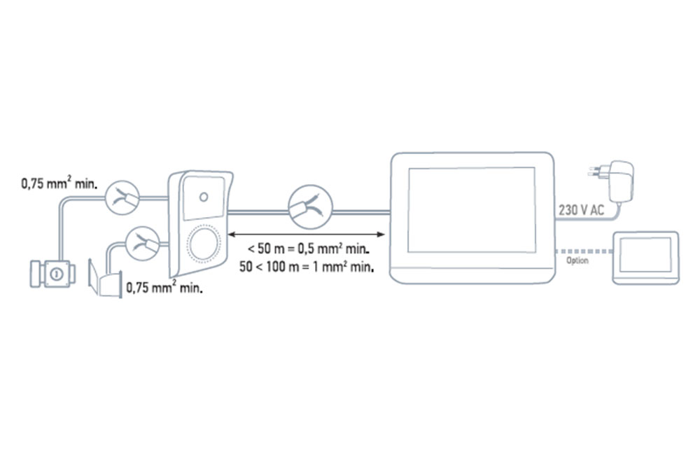 Подключение к кнопочной панели всего 2 проводами (до 100 м);