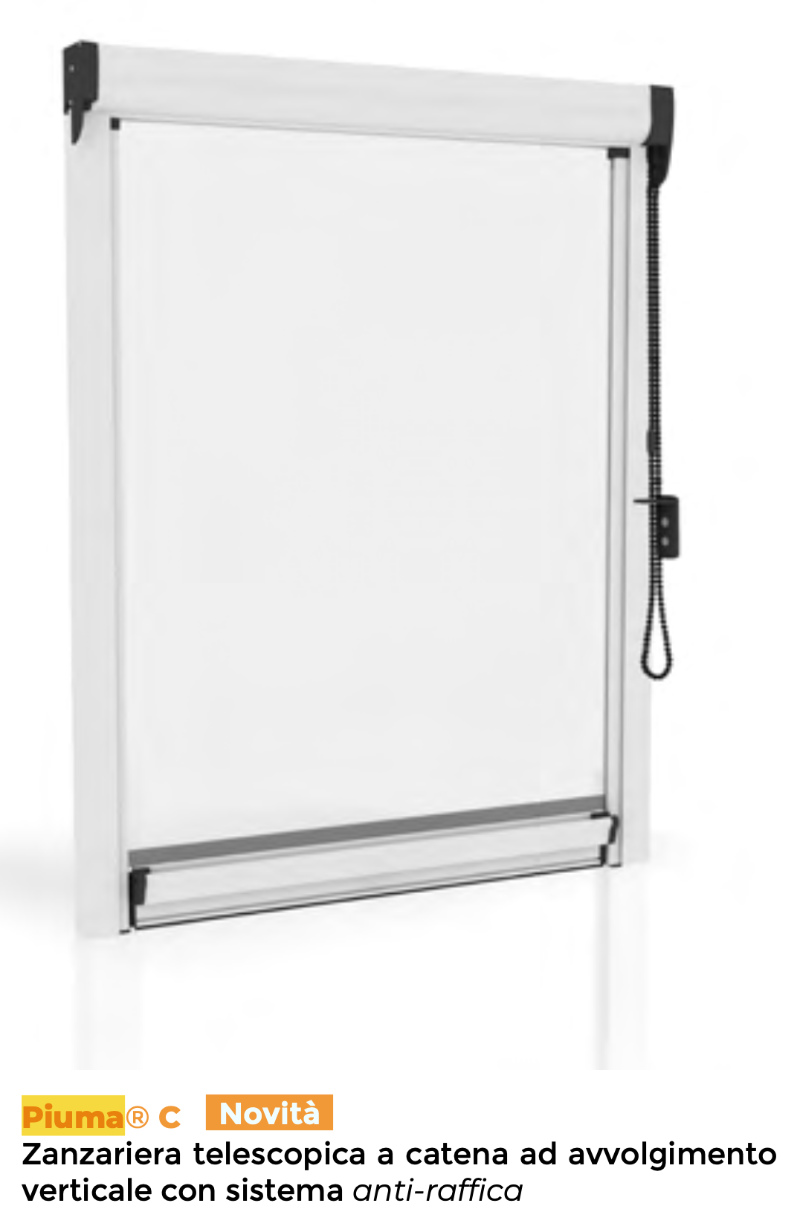 Цепная москитная сетка Piuma C Effezeta System представляет собой телескопическую модель с цепочкой и вертикальной намоткой, выполненной со специальной