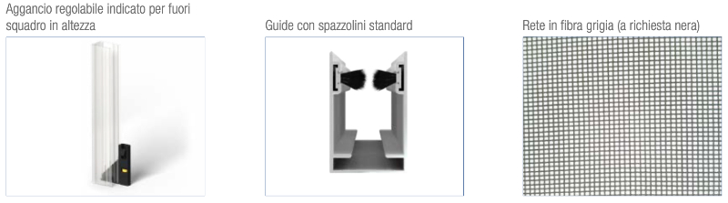 Практичный и быстрый в установке, он скользит внутри боковых направляющих, оснащенных щетками (также в ветрозащитном исполнении), которые предотвращают разрыв ткани в случае случайного удара о сетку.