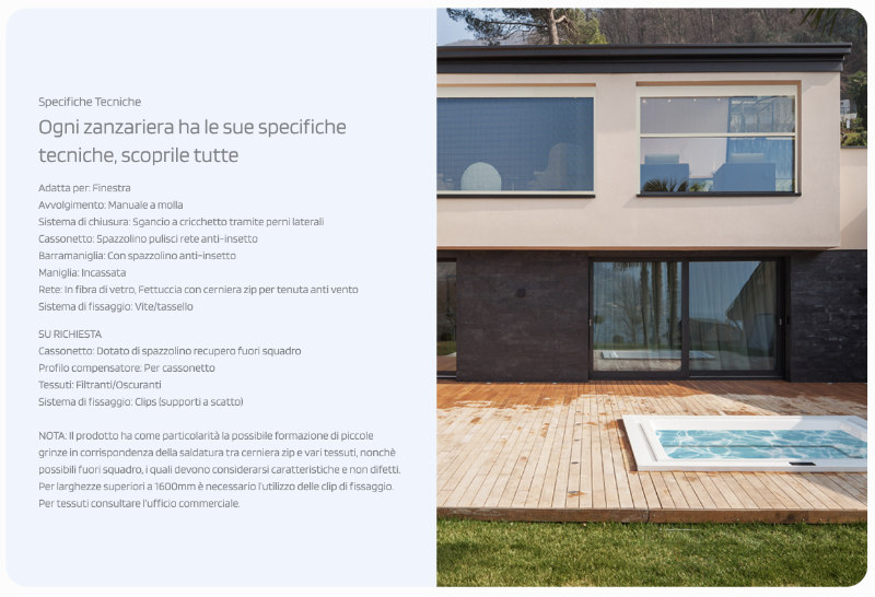 За прошедшие годы Officine Rami усовершенствовала свой ассортимент продукции, создав широкий выбор противомоскитных сеток, отвечающих любым потребностям, как с точки зрения стиля, так и с точки зрения функциональности. Эти качественные продукты ценятся за свою долговечность и надежность, а их конструкция позволяет легко вписаться в различные поверхности и помещения. Доступные в богатой цветовой гамме, они гармонично интегрируются с внешней средой как с структурной, так и с цветовой точки зрения.